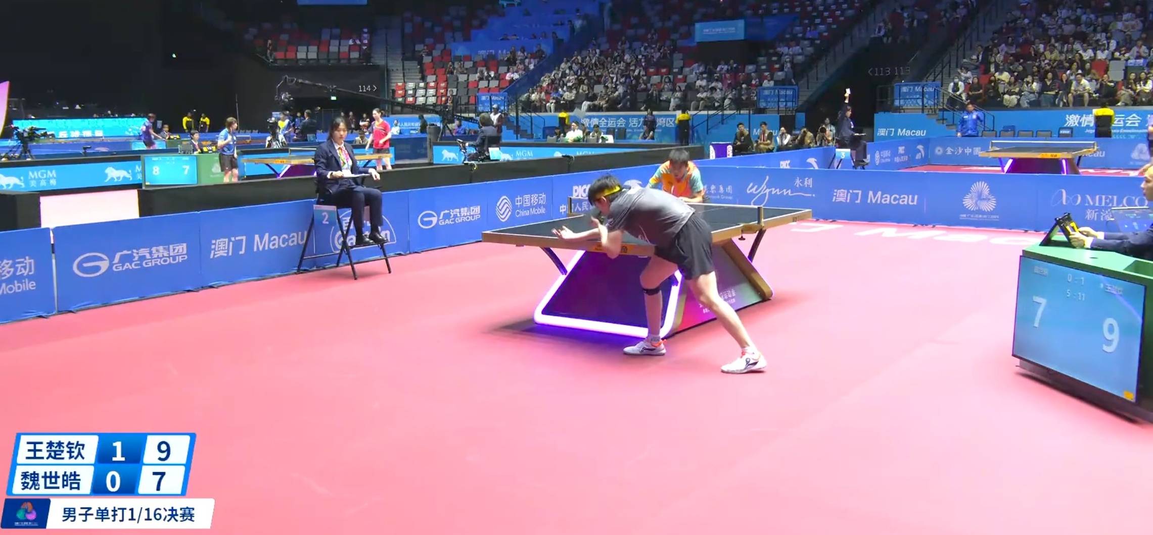 第一局,开局双方在发接发环节比拼,王楚钦的勾手发球变化比较多,王楚钦利用发球优势打开局面取得5-2的开局,随后魏世皓加强前三板控制追至5-6,不过随后王楚钦连得5分,11-5先下一城。
